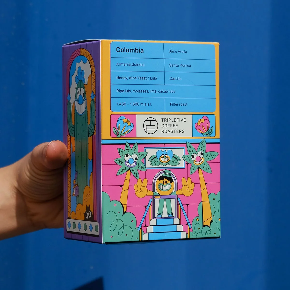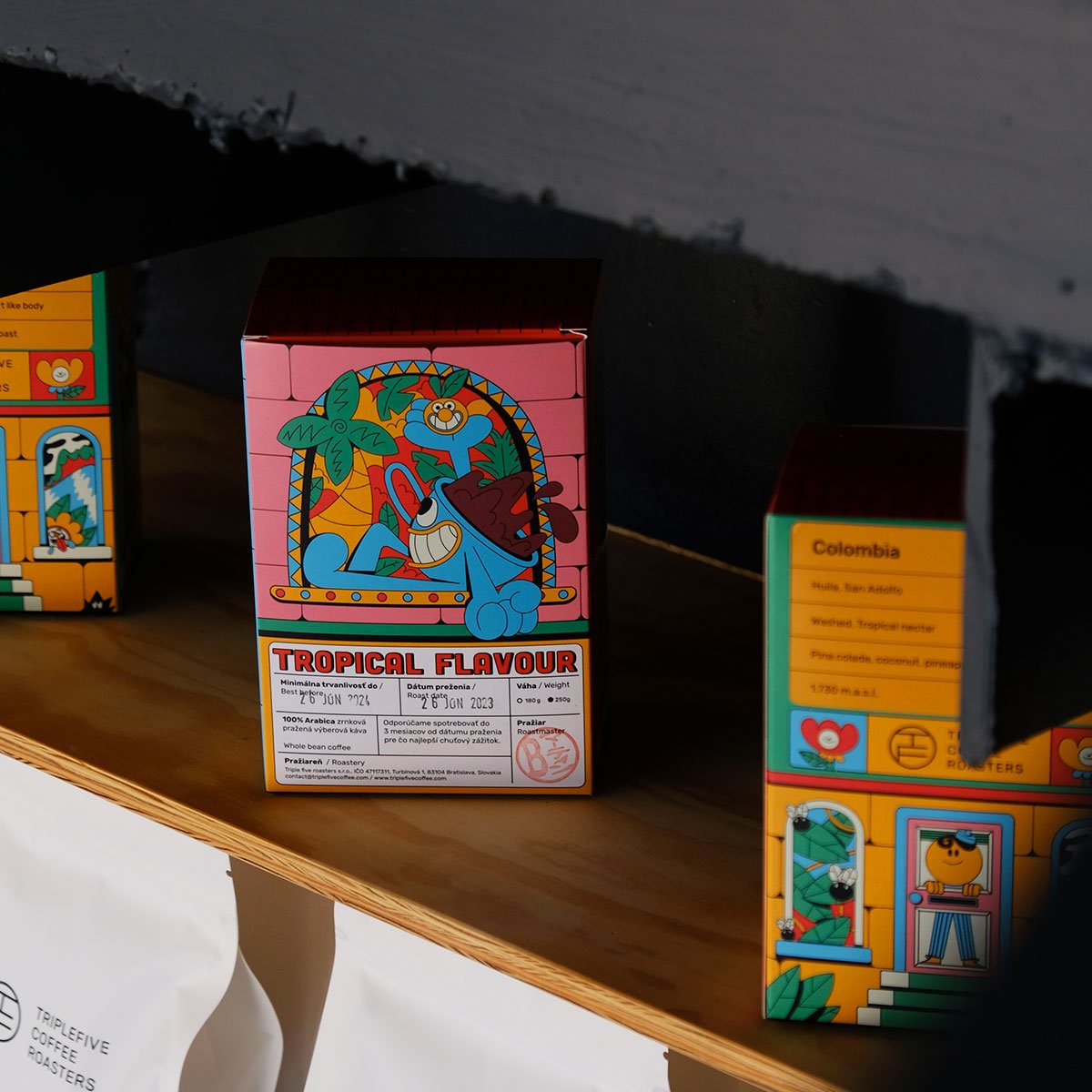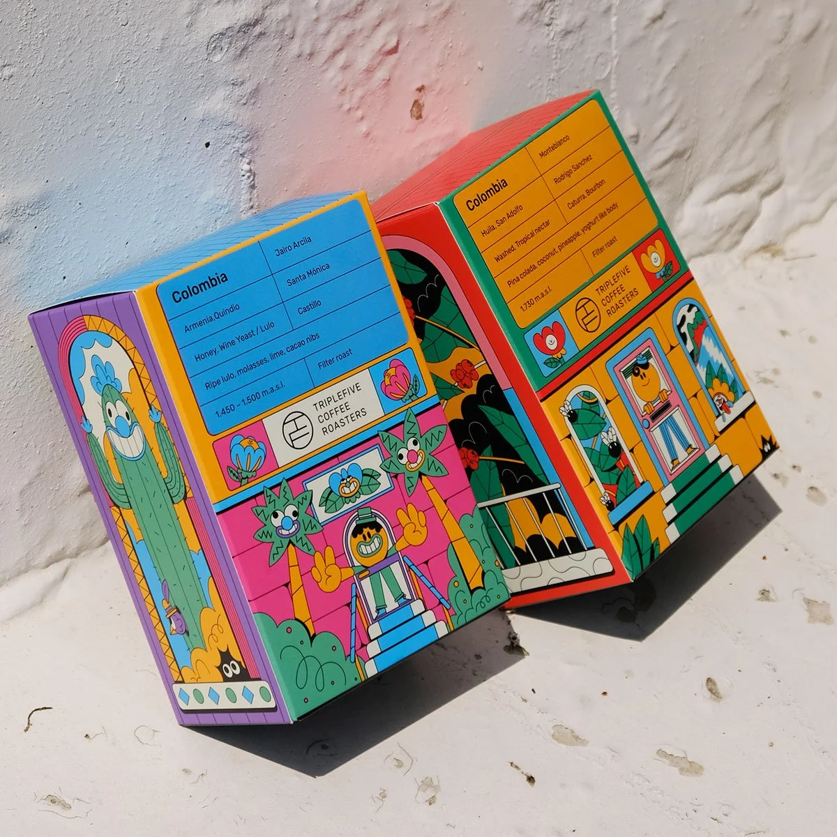 I designed four colorful coffee boxes for Triple Five Coffee, inspired by the taste and mood of the different coffee variaties, resembling colorful buildings.