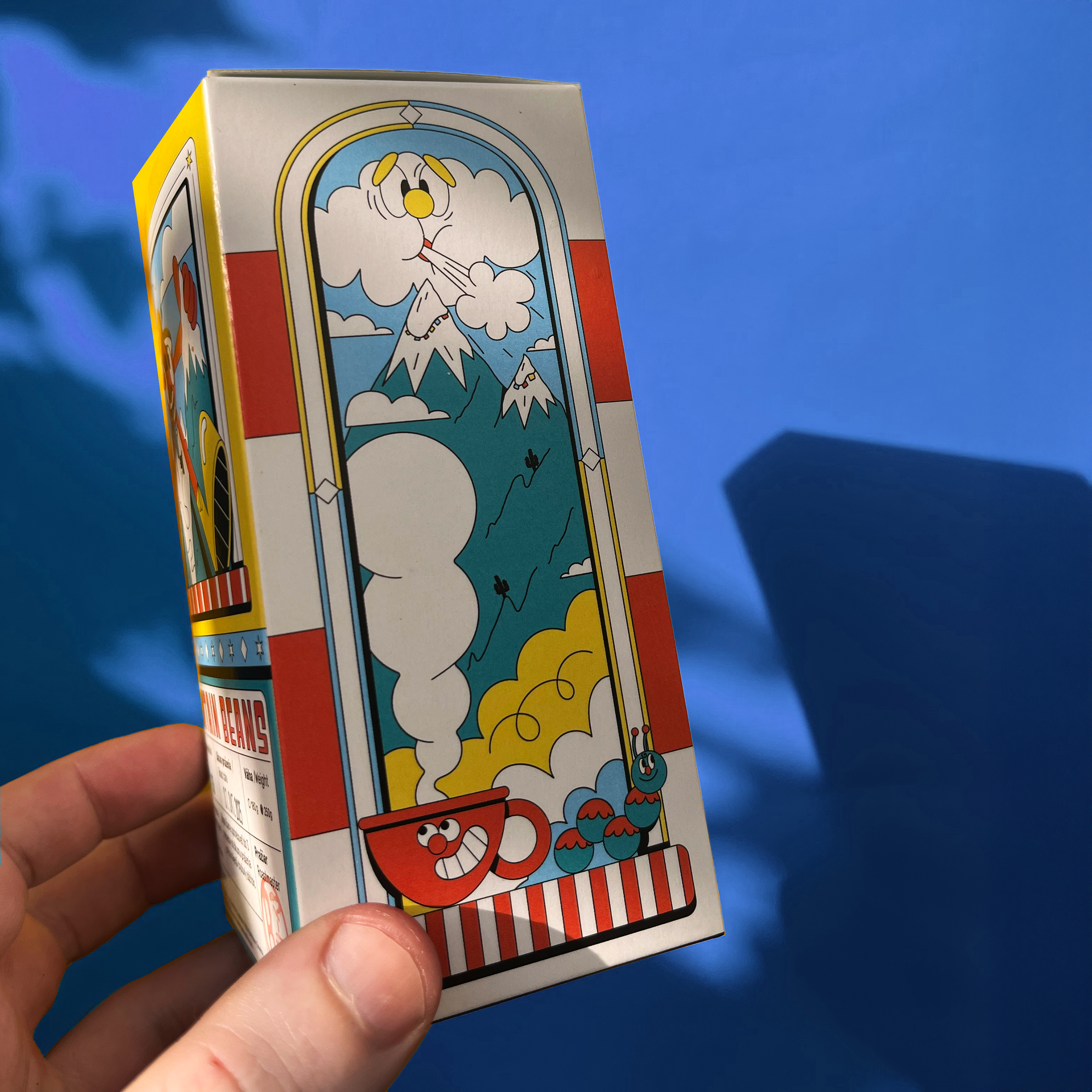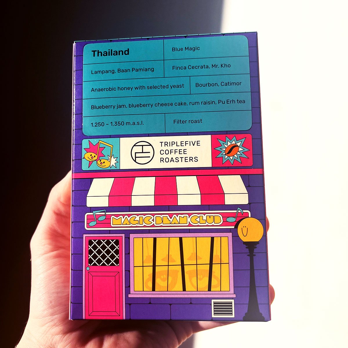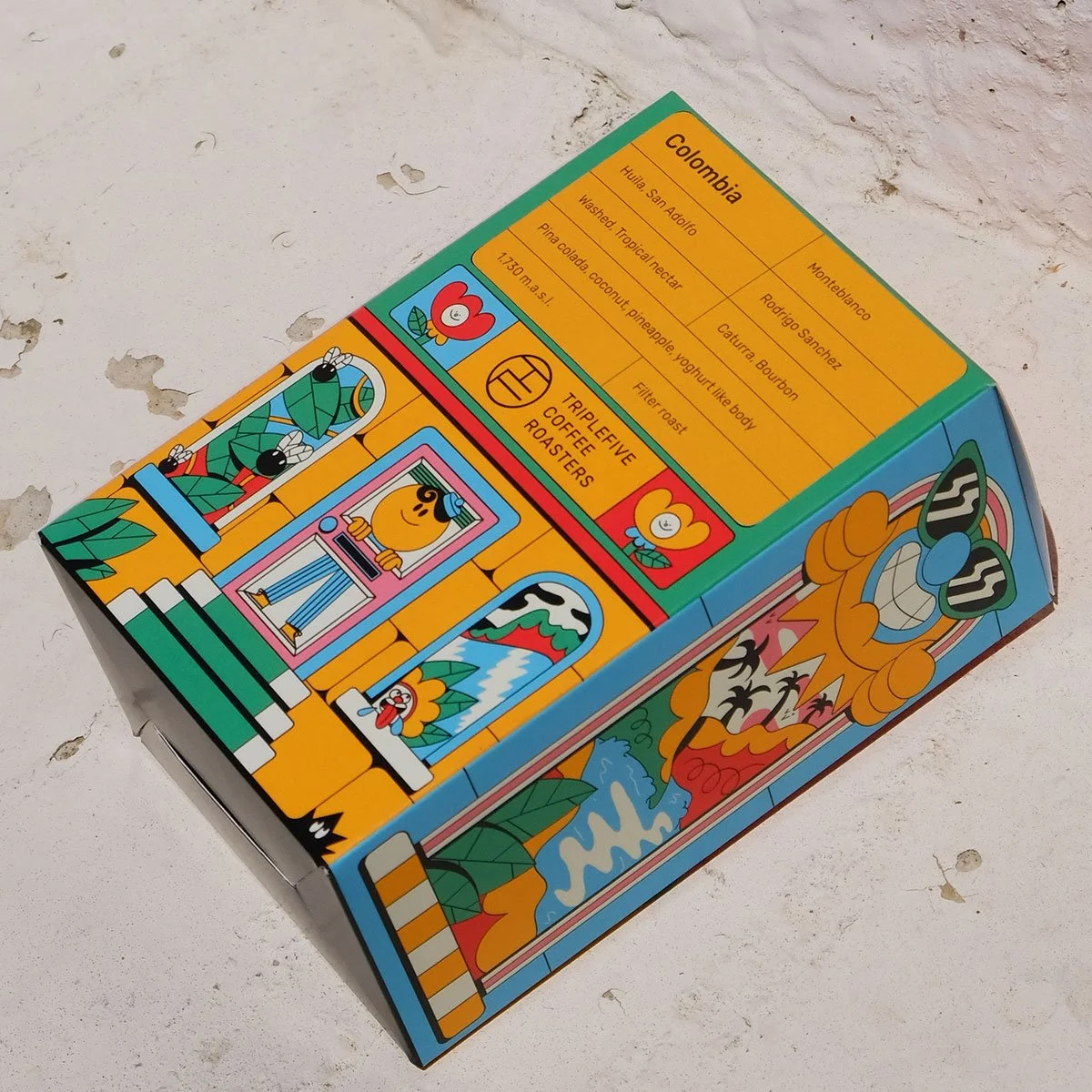 I designed four colorful coffee boxes for Triple Five Coffee, inspired by the taste and mood of the different coffee variaties, resembling colorful buildings.